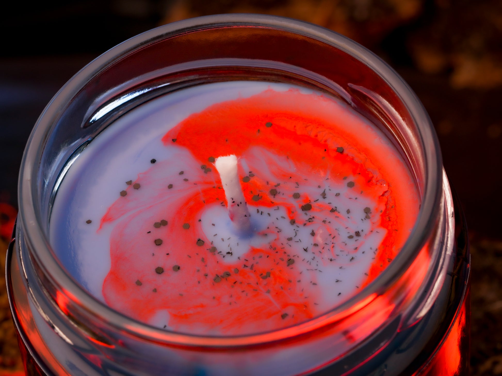 It can feature details such as decorative melts on the surface, colorful marbled edges, or unique effects. Each candle is different.