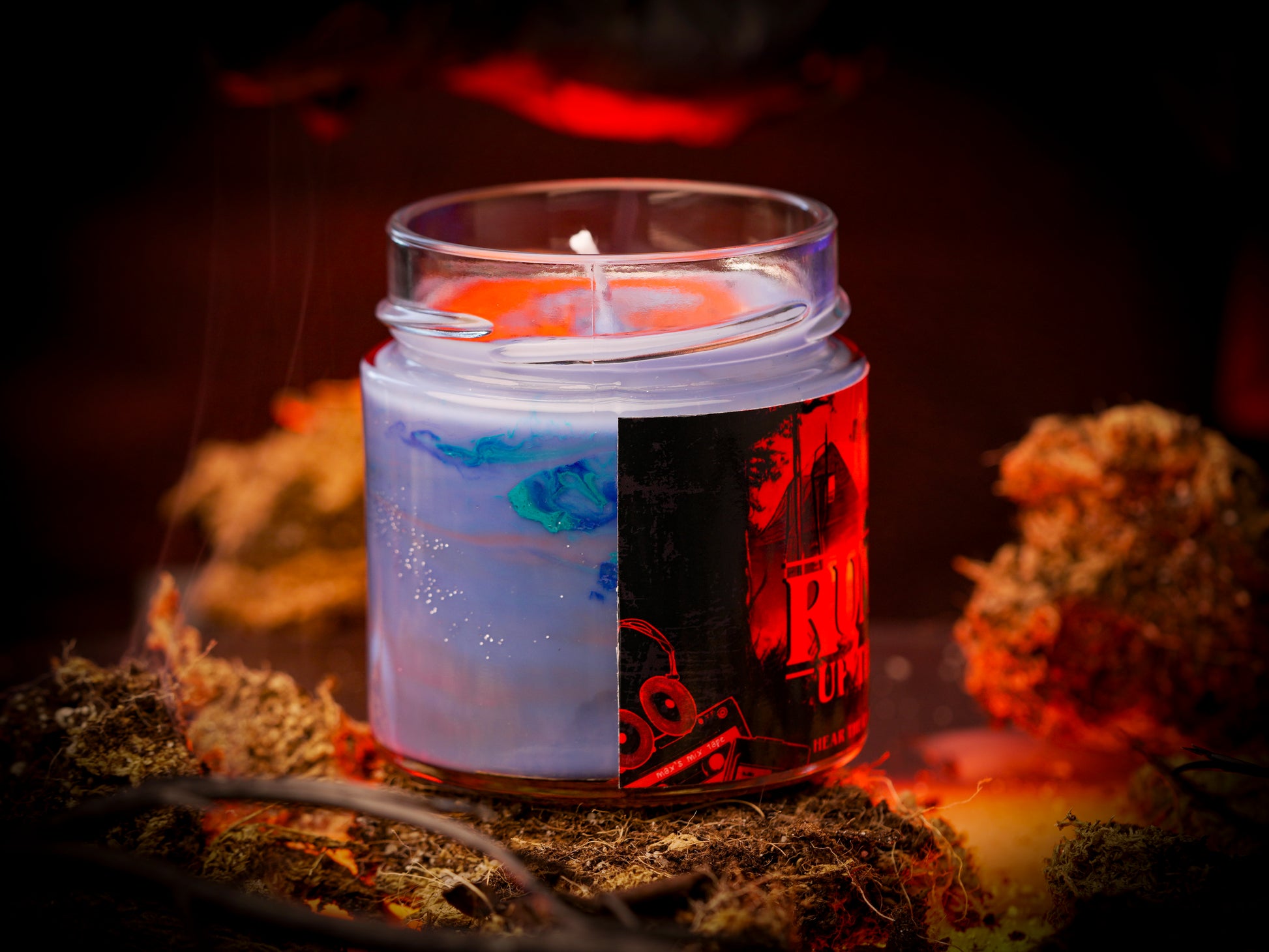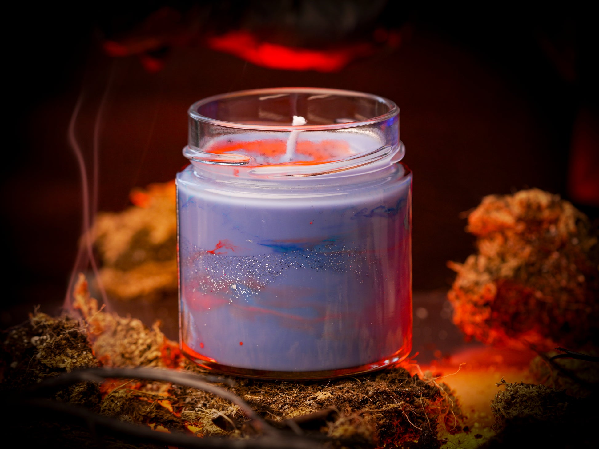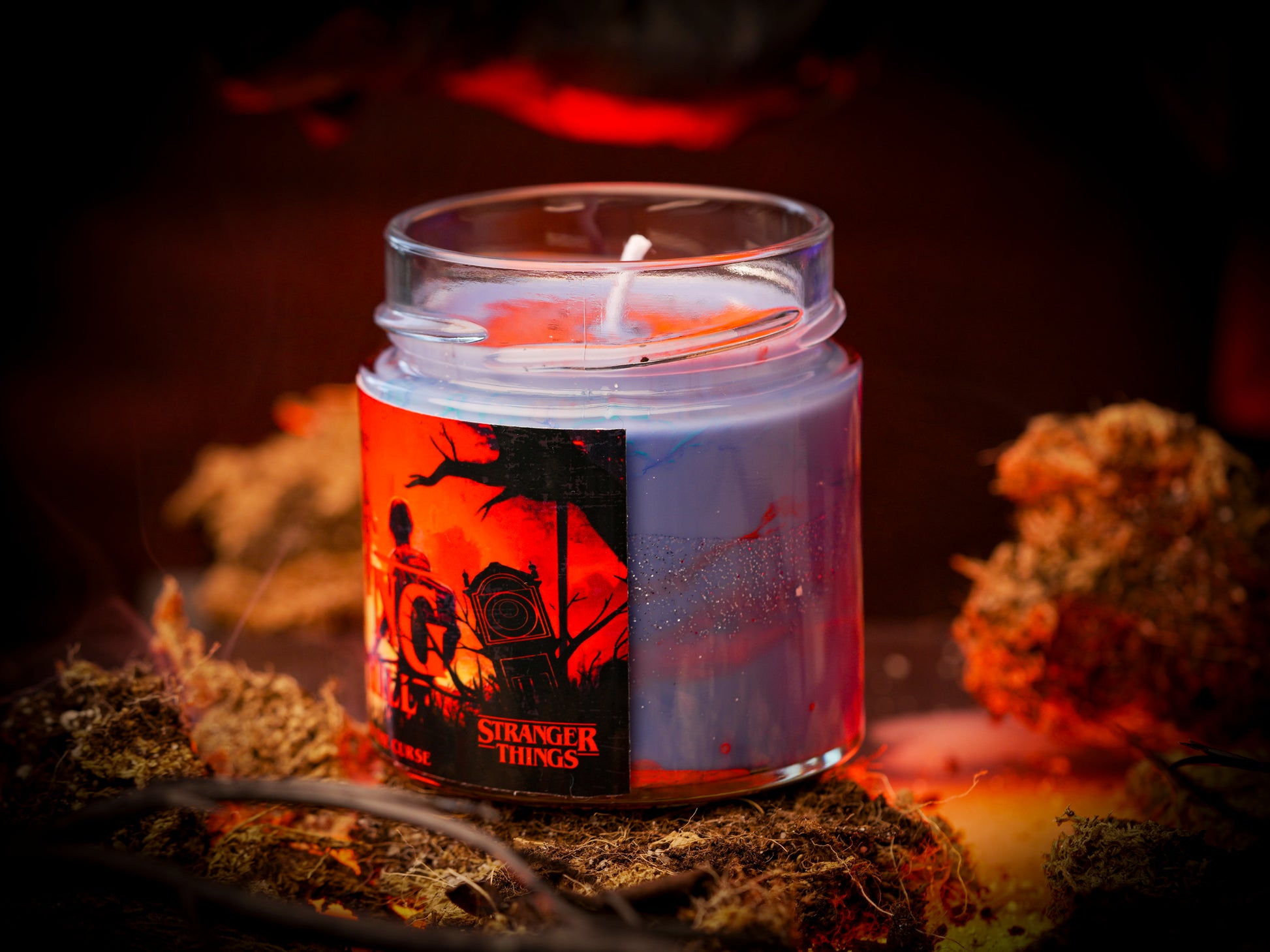 Una versión más sutil, pero igual de mágica. Esta vela está teñida en un azul profundo, con un marmoleado en el lateral del tarro que recuerda a la grieta que separa nuestro mundo del Upside Down.